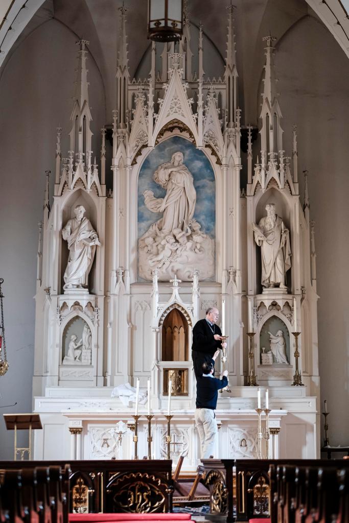 El padre Bede Price, pastor de la Iglesia de la Asunción, limpia el altar después de que un tornado azotara Nashville, Tennessee, EE. UU. (Foto Guatevisión: EFE).