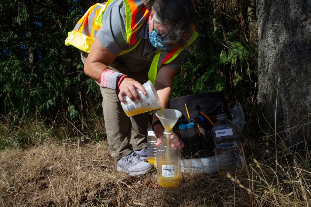 Las trampas consisten en una botella que contiene una mezcla de jugo de naranja y vino para cocinar arroz. Se revisan una vez a la semana.