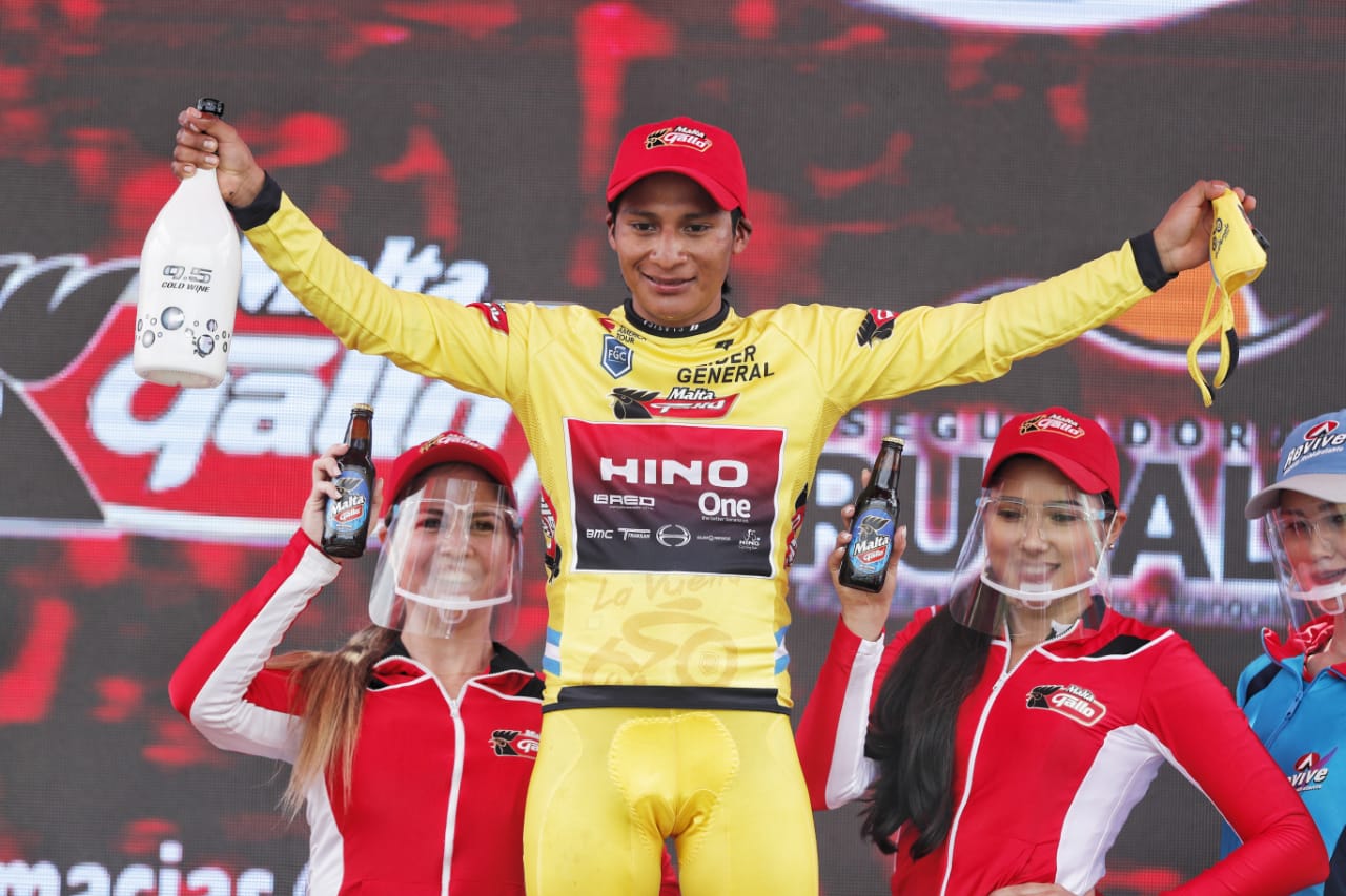 Mardoqueo Vásquez mantiene el liderato general de la Vuelta a Guatemala tras finalizar la sexta etapa del giro nacional. Foto Esbin García.