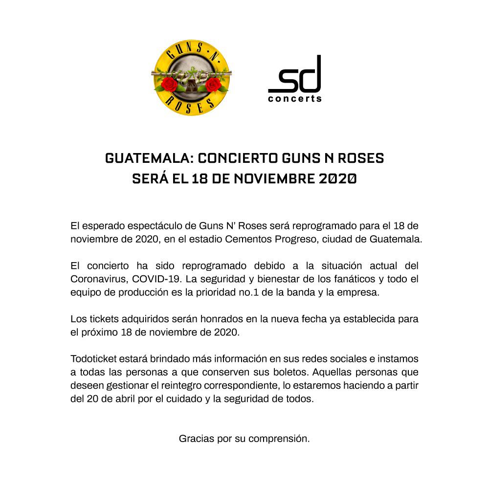 El caso de Guns N´ Roses en Guatemala fue similar a lo que sucedió recientemente en Costa Rica y los músicos estadounidenses reaccionaron a la decisión. “El espectáculo de Costa Rica ha sido pospuesto debido a la dirección del gobierno. Se reprogramará para más adelante en el año, así que conserven sus boletos”, fue el mensaje que publicó Guns N´ Roses en las cuentas oficiales en redes sociales, algo que esperan los guatemaltecos, quienes anhelan ver a sus ídolos en directo.