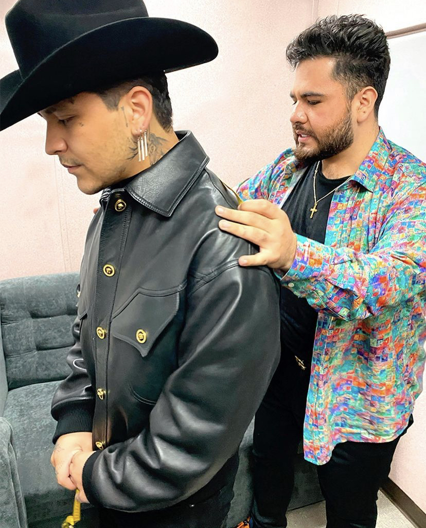 El diseñador compartió una imagen con Christian Nodal, donde se le ve al cantante esperando a que le tomen medidas.
