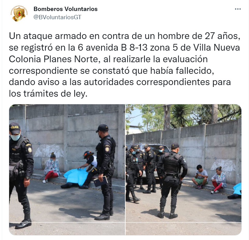 Bomberos Voluntarios atendieron a un hombre de 27 años, quien resulto herido en un ataque armado en la 6a. avenida B 8-13 zona 5 de Villa Nueva Colonia Planes Norte, al procederle a la evaluación se constató que había fallecido.