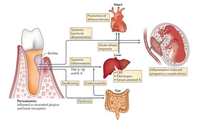 Además, se ha descubierto que algunas bacterias que aumentan durante la periodontitis y compuestos producidos por ellas pueden llegar a diferentes partes del cuerpo por la vía sanguínea o gastrointestinal. Se han detectado dichas bacterias dentro de células inmunes circulando por la sangre, placa aterosclerótica, la placenta y tumores intestinales, entre otros.