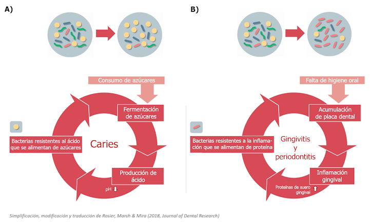 Por ejemplo, si consumimos azúcar, las bacterias de la placa dental que se alimentan de azúcares aumentan en número. Estas convierten el azúcar en ácidos orgánicos (Figura 2A). Algunas productoras de ácido son muy resistentes a ello, mientras que las sensibles mueren.