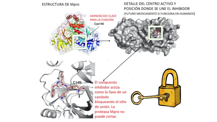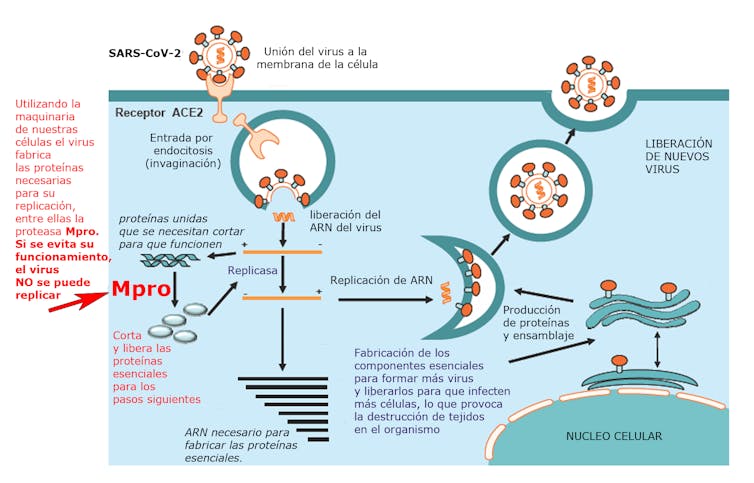 Esta proteína se produce inicialmente en una forma larga no funcional, lo que se conoce como “polipéptido”. Así que, para empezar a trabajar, primero debe ser cortada por medio de una especie de tijeras, una proteasa llamada Mpro. Uno de los pedazos resultantes del corte será la proteína del virus que permite que este se multiplique. Pues bien, esta proteasa es una “diana” ideal para diseñar un medicamento antiviral. Al fin y al cabo, si la proteasa no funciona, el virus no se puede multiplicar, no puede producir la infección, y el paciente se cura.