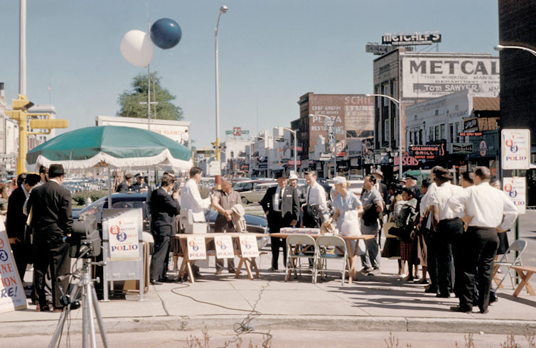 Vecinos de Columbus, Georgia (EE. UU.), esperando a ser vacunados contra la poliomielitis durante los primeros días del Programa Nacional de Inmunización contra la Poliomielitis, en 1961.