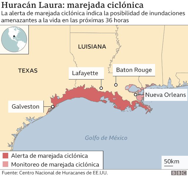 El NHC informó que el ojo de Laura llegó primero el distrito de Cameron de Luisiana a la 01:00 am hora local (06:00 GMT) y urgió a la población a protegerse.