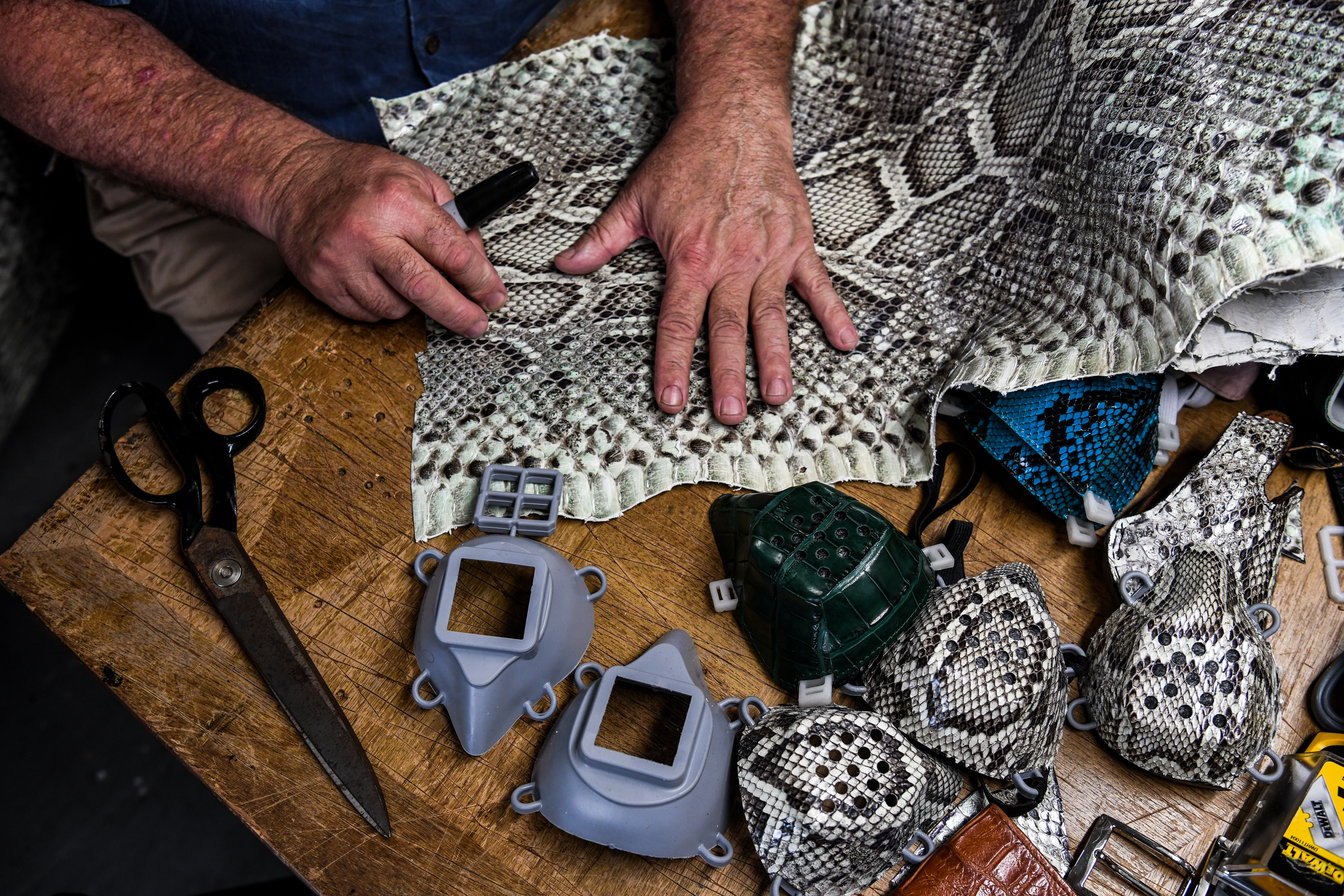 Brian Woods, un artesano de 63 años que hace toda clase de productos con pieles de reptiles, se percató de que la gente comenzaba a llevar mascarillas cada vez más creativas para protegerse de la pandemia, y decidió surfear la misma ola.