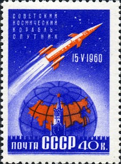 Sello postal de 1960 celebrando el liderazgo soviético en la carrera espacial.