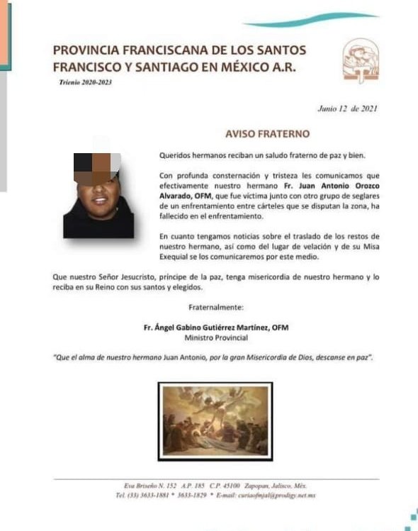 La Provincia Franciscana de los Santos Francisco y Santiago, congregación a la que pertenecía el Padre Juan Antonio Orozco Alvarado, despidió al párroco por medio de un obituario.