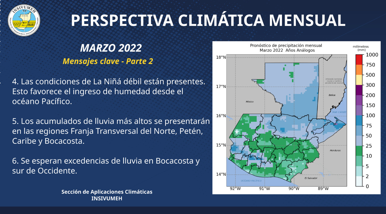 También se esperan acumulados de lluvia considerables (entre 75 a 100 mm para el mes) en Boca costa y en el sur de la región Occidente.
