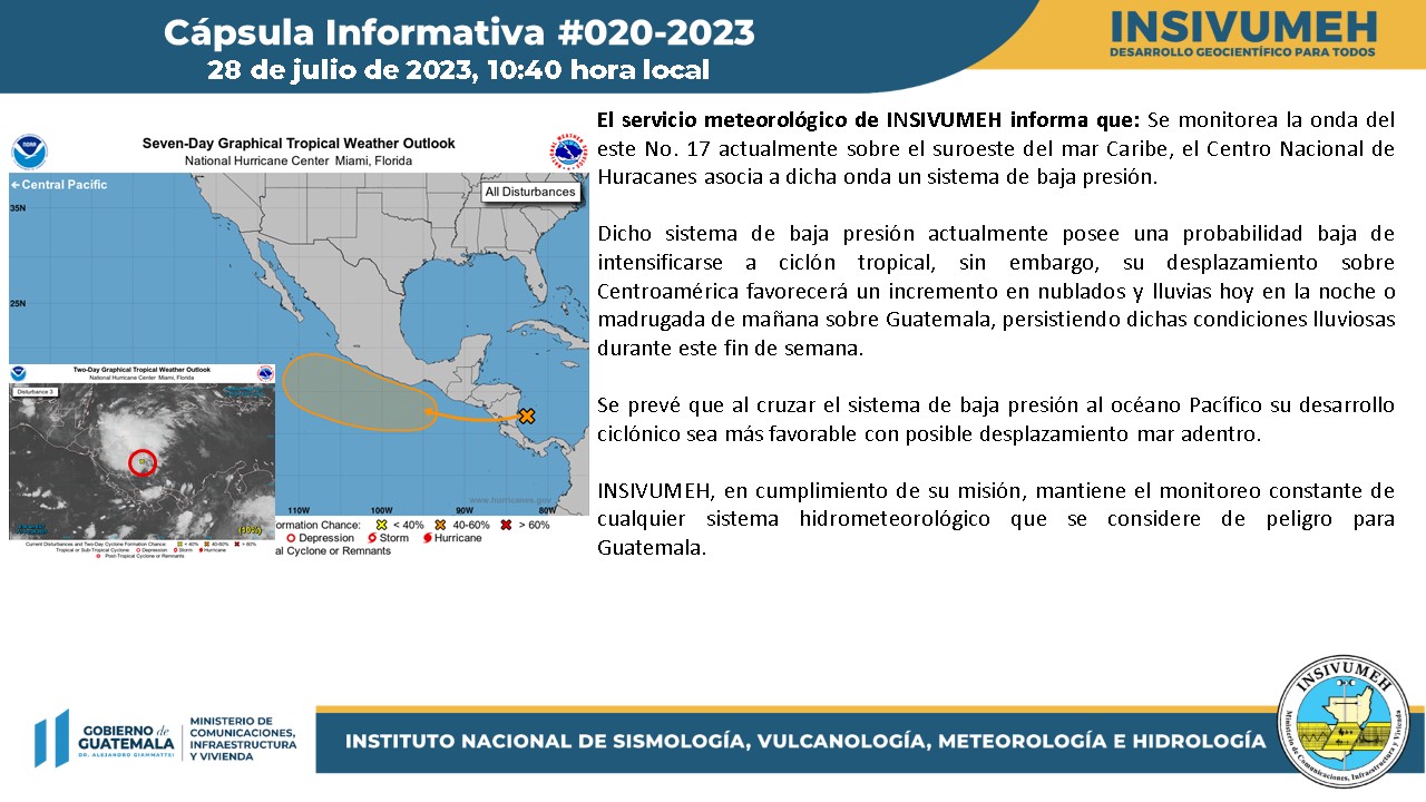 El servicio meteorológico de Insivumeh informó este viernes 28 de julio que monitorea la onda del este 17, actualmente sobre el suroeste del mar Caribe. Mientras que el Centro Nacional de Huracanes asocia a dicha onda un sistema de baja presión.
