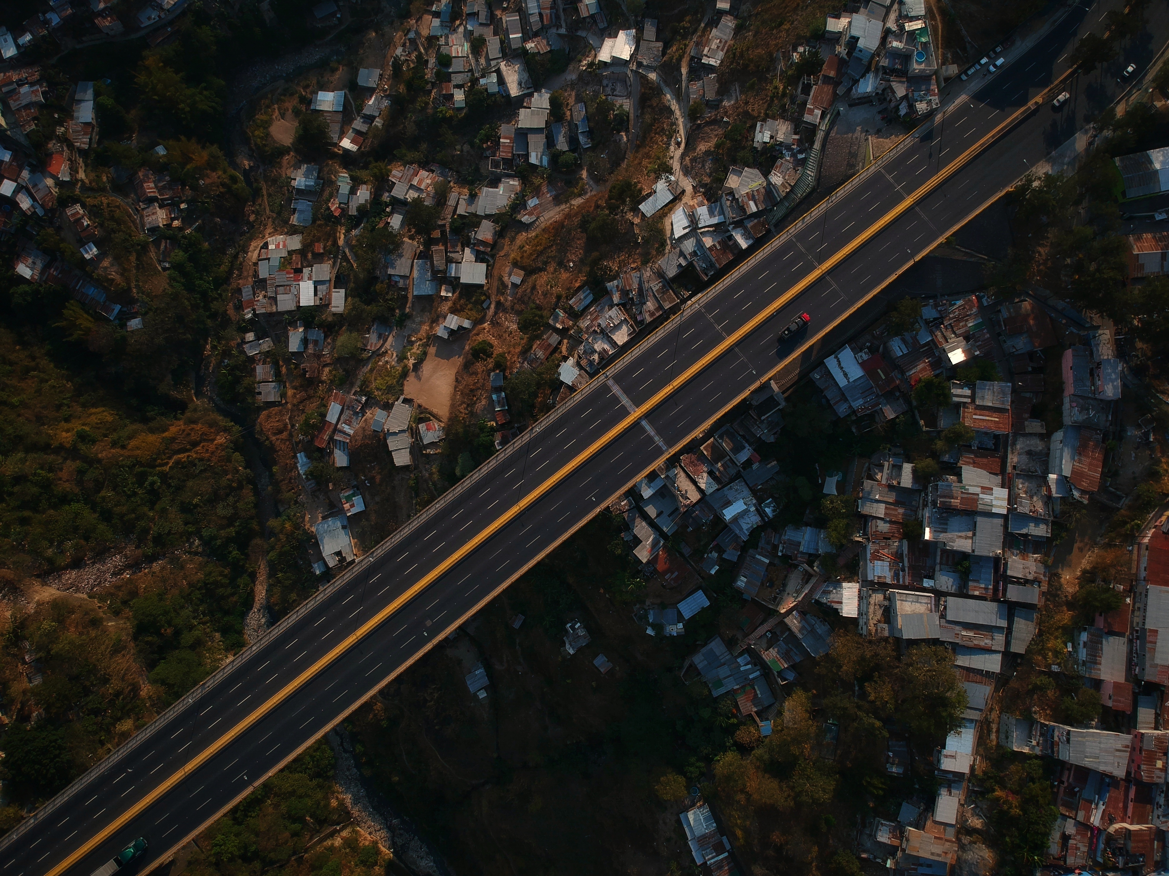 Abajo de esta estructura se observan las casas de miles de guatemaltecos que cumplen con el toque de queda decretado por el Gobierno de Guatemala para evitar los contagios de covid-19 en el país.