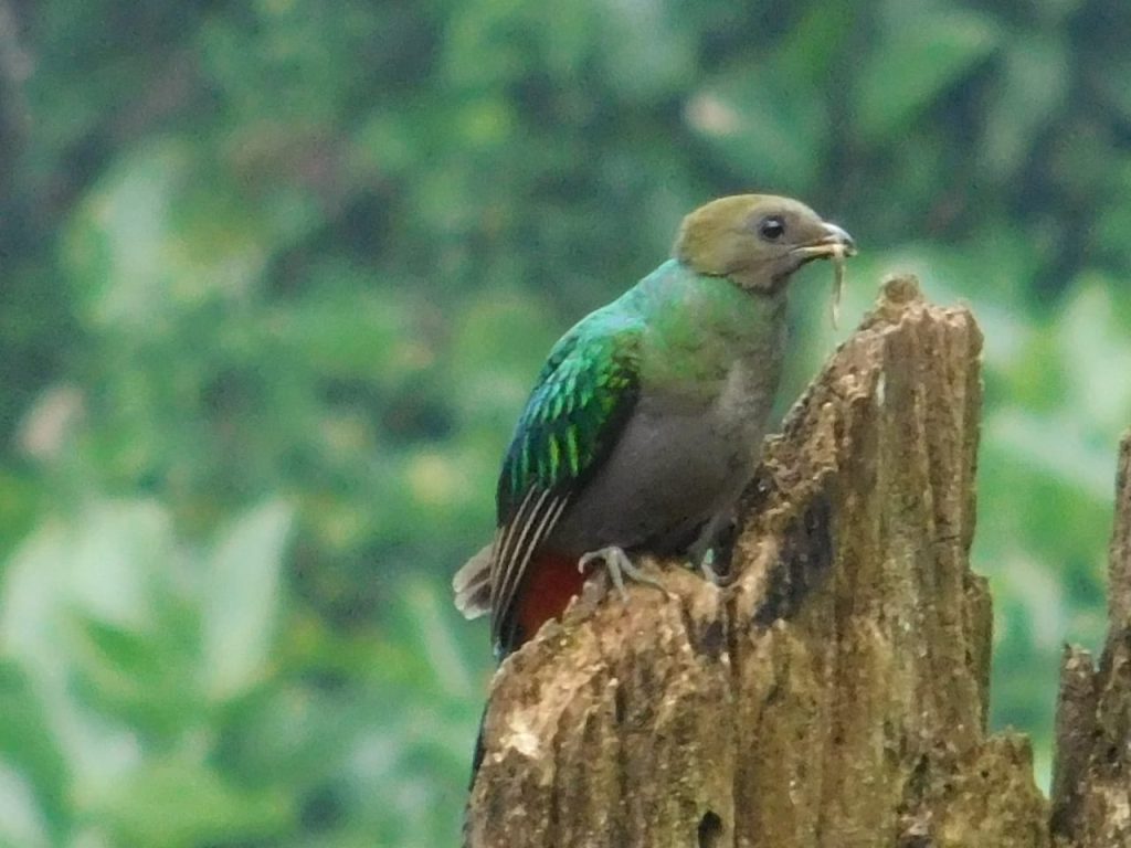 Hace unos meses solo se observaban aves macho, pero hace unos 15 días se determinó que son una pareja de quetzales llevando alimento a sus crías.
