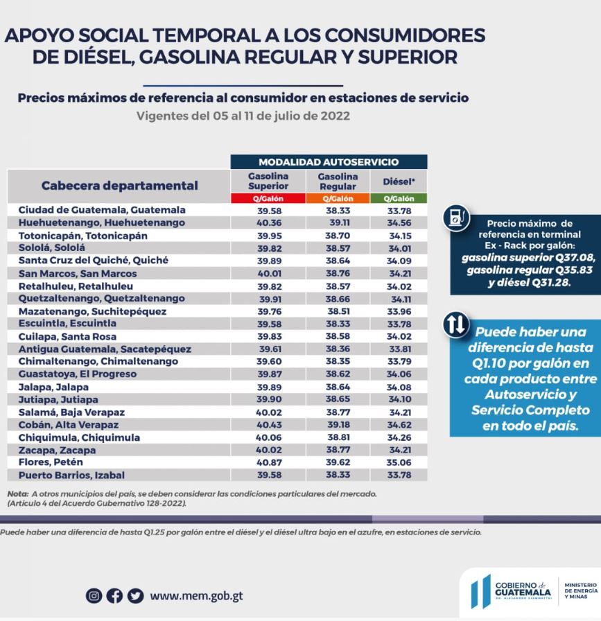 Estos precios tienen aplicado subsidio que otorga el Estado y que rige mediante la aprobación de la Ley de Apoyo Social Temporal a los Consumidores de Diésel y Gasolinas Regular y Superior, que establecen una reducción de Q5 por galón de gasolinas súper y regular y Q7 para el diésel.