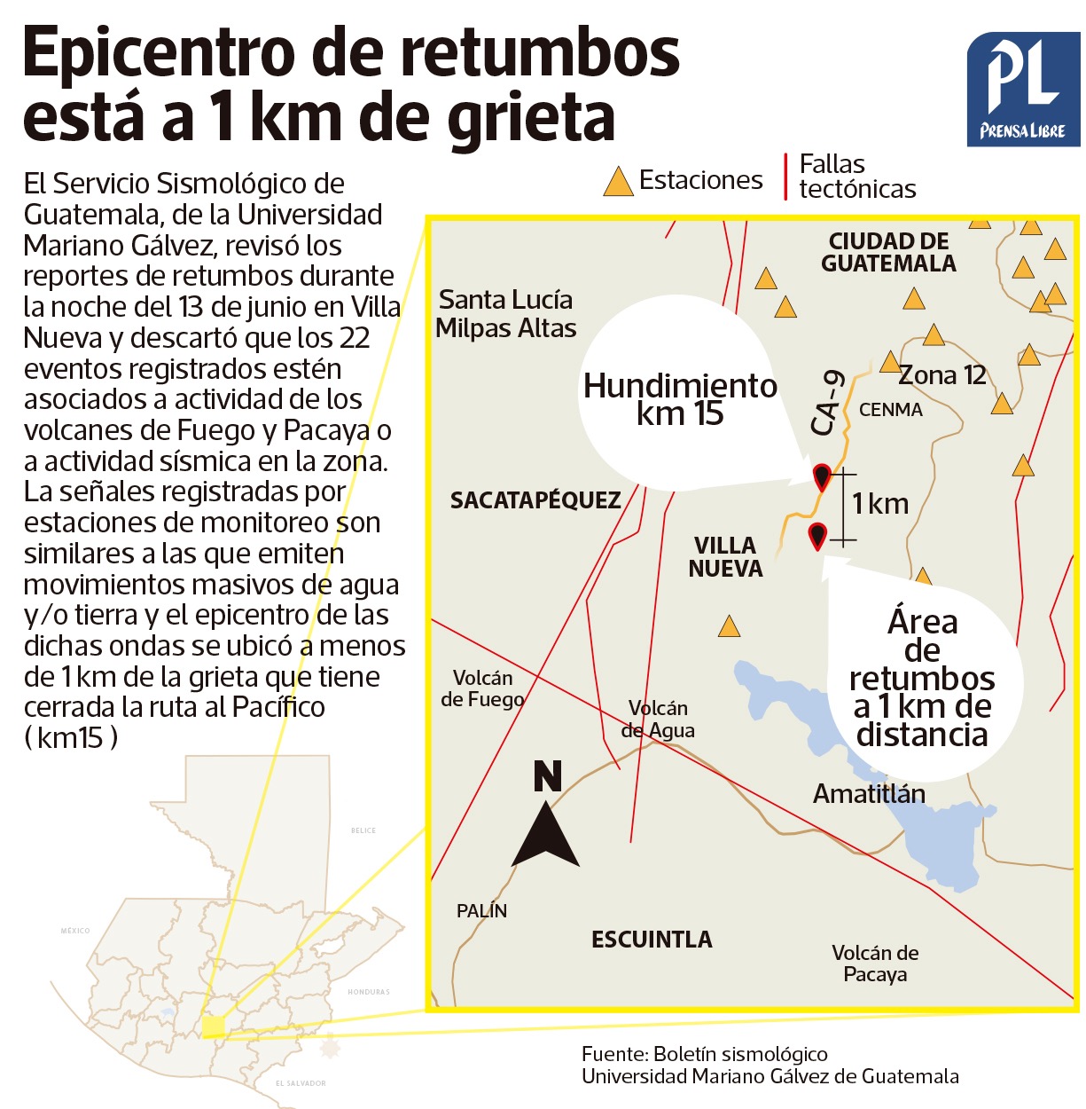 El del Servicio Sismológico de Guatemala (SSG) de la Universidad Mariano Gálvez (UMG), emitió un informe con resultados de su investigación sobre los temblores y retumbos que reportaron vecinos del área metropolitana la noche del 13 de junio y su relación con una grieta y la caverna que se formó en el km 15 de la ruta al Pacífico, en Villa Nueva.