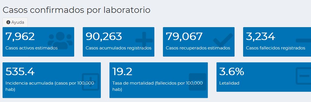 La incidencia acumulada de casos por cada 100 mil habitantes es de 535.4, la tasa de mortalidad por esa misma cifra de pobladores es de 19.2 con una letalidad de 3.6%.