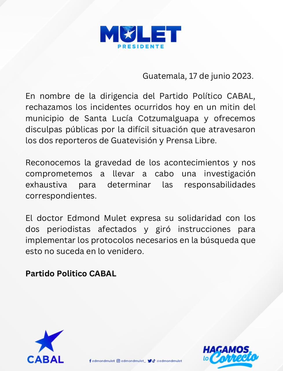 “En nombre de la dirigencia del Partido Político CABAL, expresamos nuestra preocupación por los incidentes ocurridos hoy en un mitin del municipio de Santa Lucía Cotzumalguapa”, indicaron.
