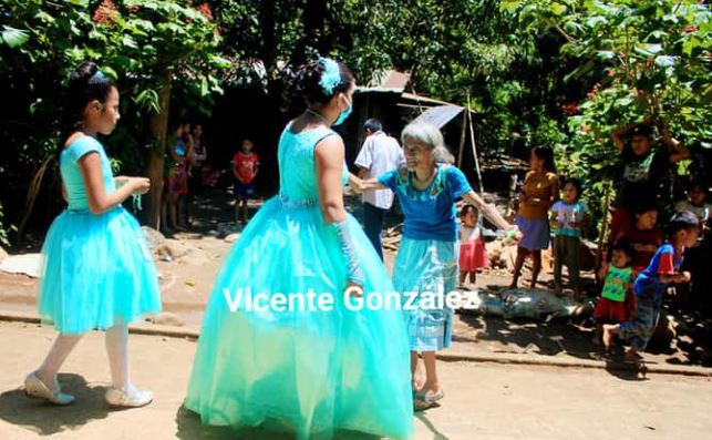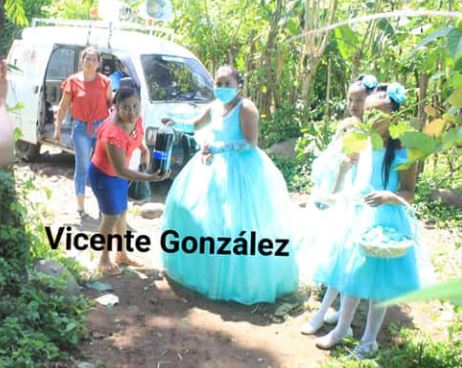 López García luciendo su vestido de quinceañera recorrió desde el sector 2 hasta el sector 1 de aldea La Felicidad, Coatepeque, donde compartió con el prójimo.