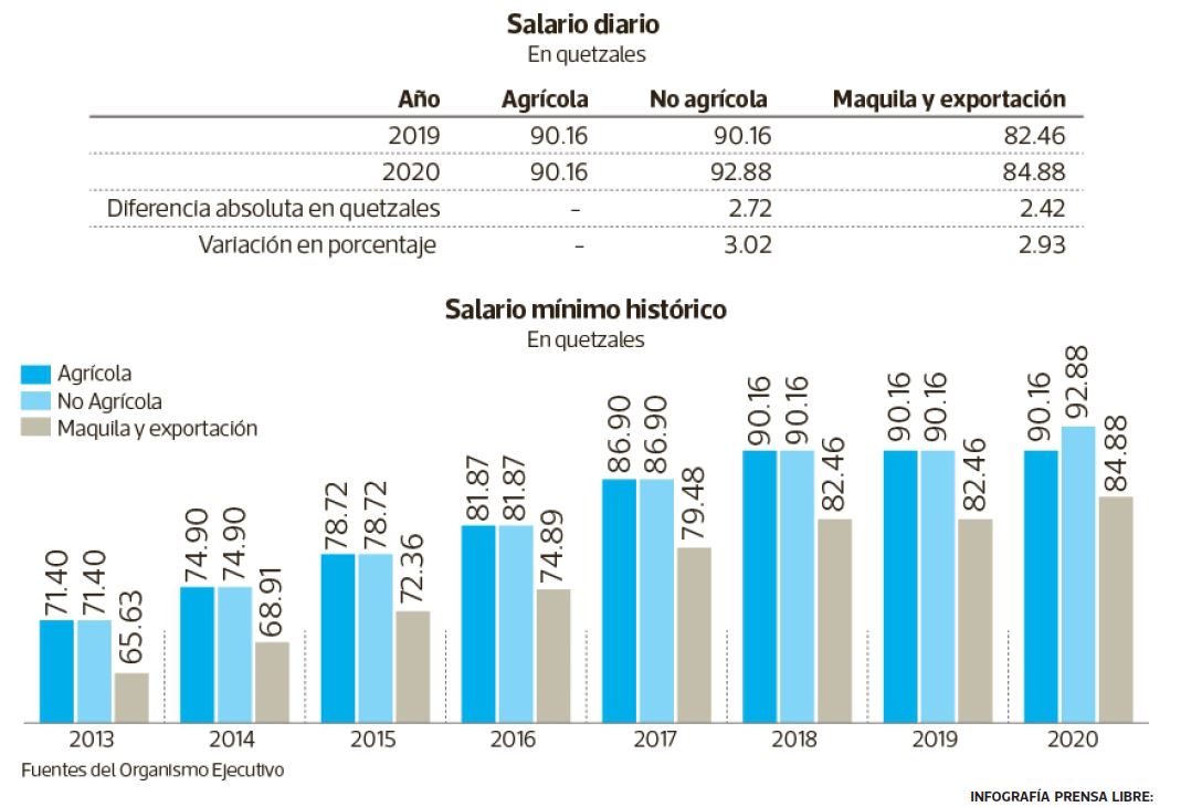 El salario mínimo 2020 en Guatemala aumentará alrededor del 3 por ciento para las actividades no agrícolas y de exportación y maquila respecto del presente año, pero seguirá sin cambios por segundo año consecutivo para las actividades agrícolas.