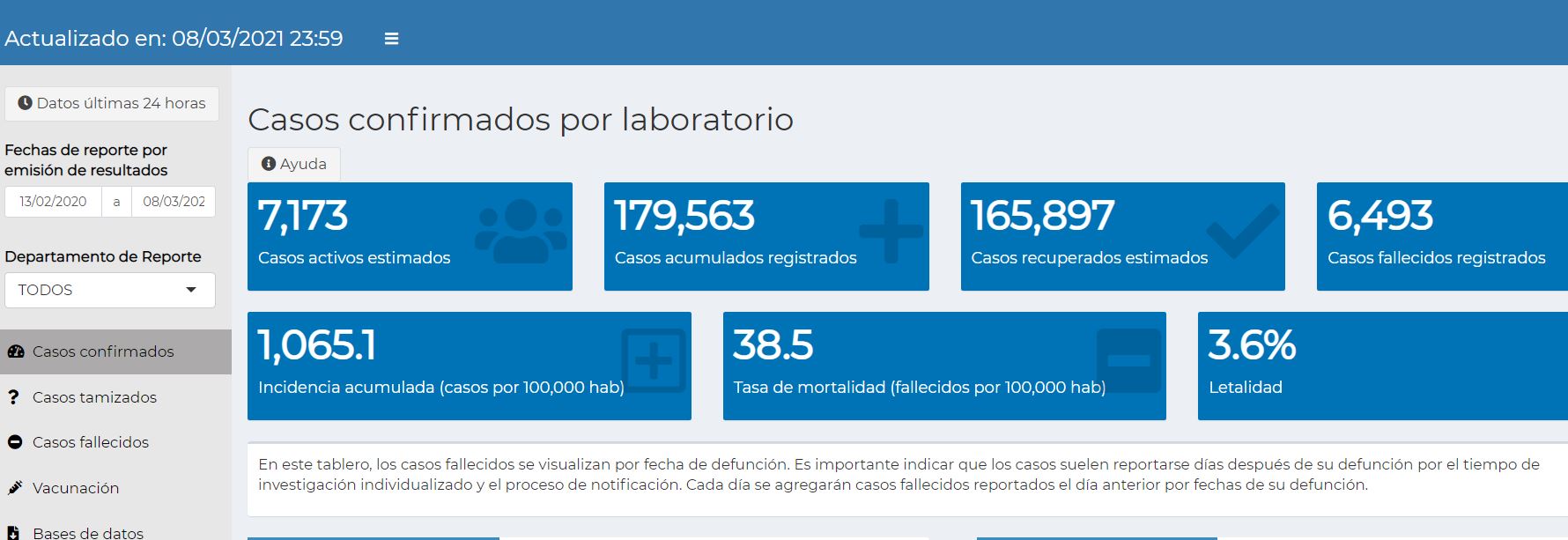 El reporte diario de casos nuevos, fallecidos y recuperados se toma del apartado “datos últimas 24 horas” del tablero del Ministerio de Salud, aunque las cifras pueden variar durante el día.
