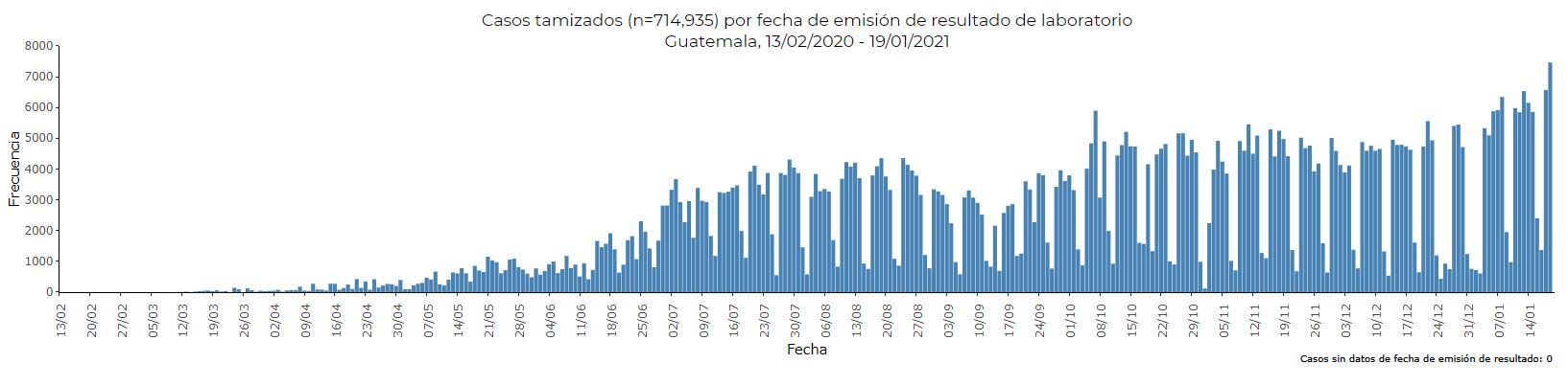 El Tablero Covid-19 en el área de casos tamizados por fecha de emisión de resultado de laboratorio revela que los datos reportados este 20 de enero, que corresponden al 19 de enero, corresponden al día con más pruebas realizadas en Guatemala desde que comenzó la pandemia, con 7 mil 335 exámenes.