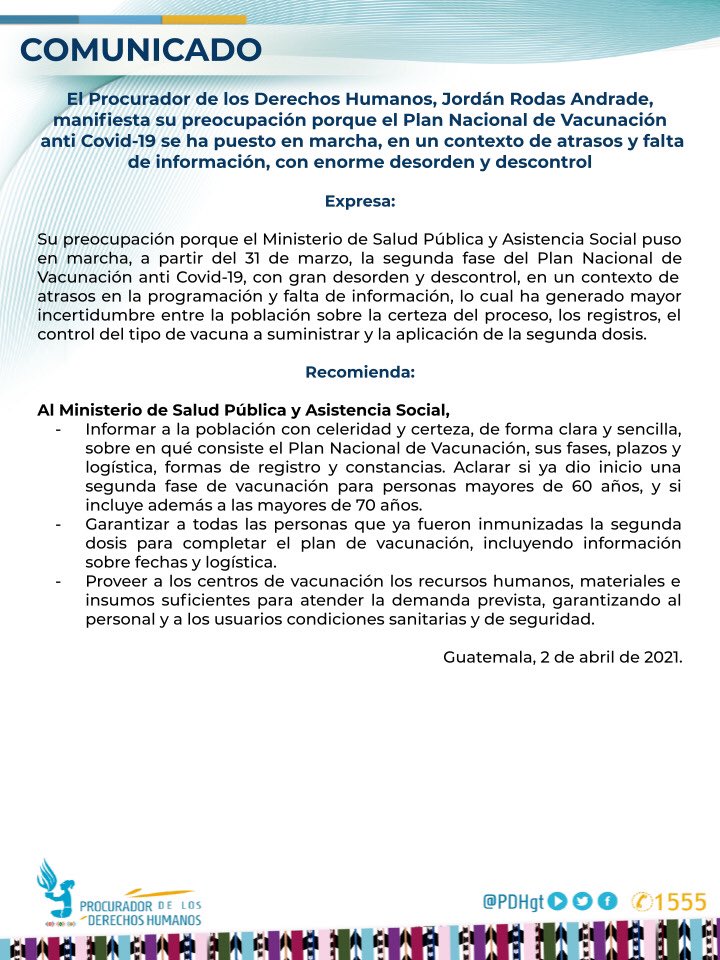 El procurador de los Derechos Humanos, Jordán Rodas, emitió un comunicado mostrando su preocupación y exigiendo al Ministerio de Salud que provea a los centros de vacunación los recursos humanos y materiales para atender la demanda.