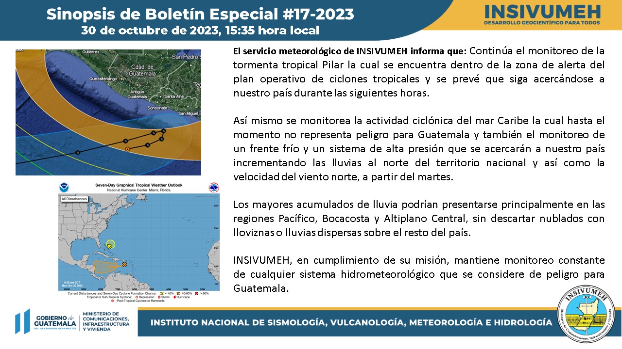El servicio meteorológico de Insivumeh informó este lunes 30 de octubre que continúa el monitoreo de la tormenta tropical Pilar la cual se encuentra al sur de las costas del Pacífico guatemalteco con centro en latitud 11.4N y longitud 91.2W. Esta tormenta ha ingresado a la zona de alerta (área naranja) del plan operativo de ciclones tropicales.