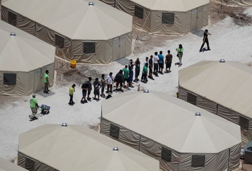 Esta imagen satelital obtenida el 20 de junio de 2018, cortesía de PlanetLabs, muestra la nueva tienda de campaña desierta para niños migrantes del Departamento de Salud y Servicios Humanos de EE. UU. En Tornillo, Texas, instalado este 19 de junio.