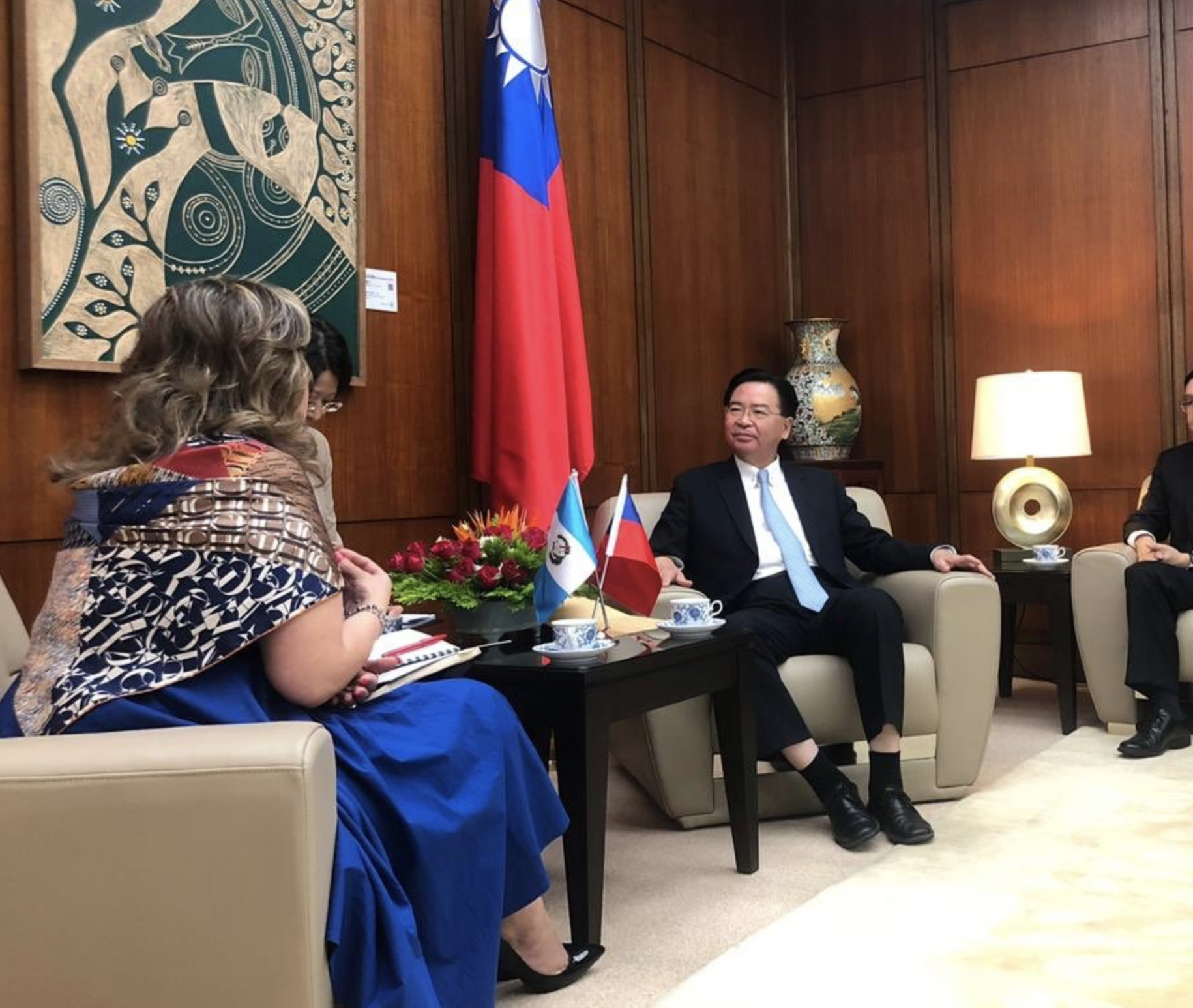 Sandra Jovel viajó junto al presidente Morales a Taiwán el pasado 28 de abril desde entonces han sostenido varias reuniones bilaterales con los funcionarios de aquel país, una de ellas es la que sostuvo con su homólogo el Embajador Jaushieh Joseph Wu, donde se reafirmó la excelente relación diplomática y estratégica que existe entre Guatemala y Taiwán.