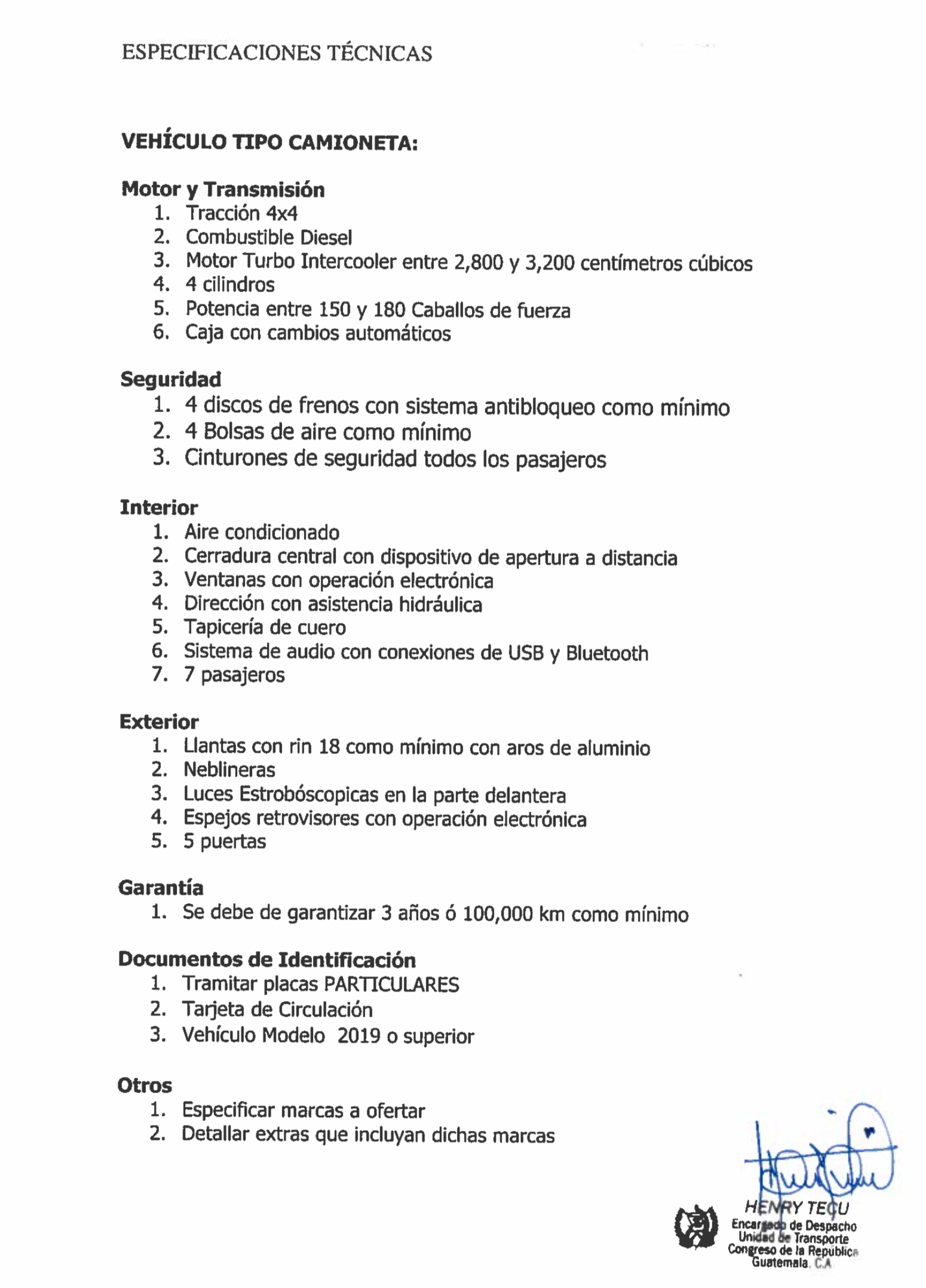 Las camionetas que quieren adquirir deben ser modelo 2019 o superior, tracción 4×4, diesel, motor turno, 4 cilindros, caja con cambios automáticos y con potencia entre 150 y 180 caballos de fuerza. Además de tapicería de cuero, aire condicionado, cerradura central, con conexión para USB y Bluetooth. Mientras los pick ups deben ser combustible diesel con turbo, tapicería de tela y caja con cambios manuales con cinco velocidades como mínimo y retroceso.