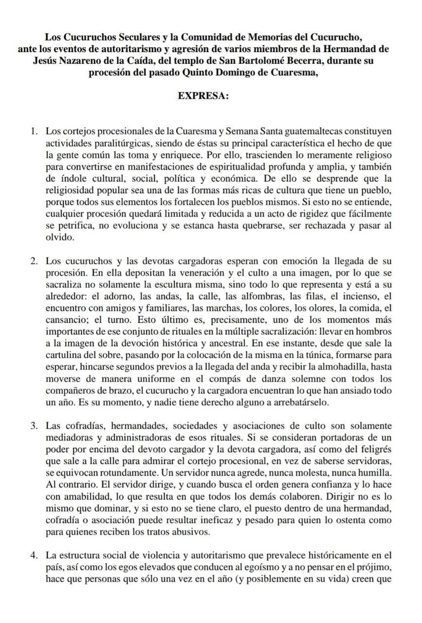 Integrantes de Cucuruchos Seculares y la Comunidad Memorias de Cucuruchos, se pronunciaron a través de un comunicado donde exponen su desacuerdo con el uso pertinente de un uniforme.