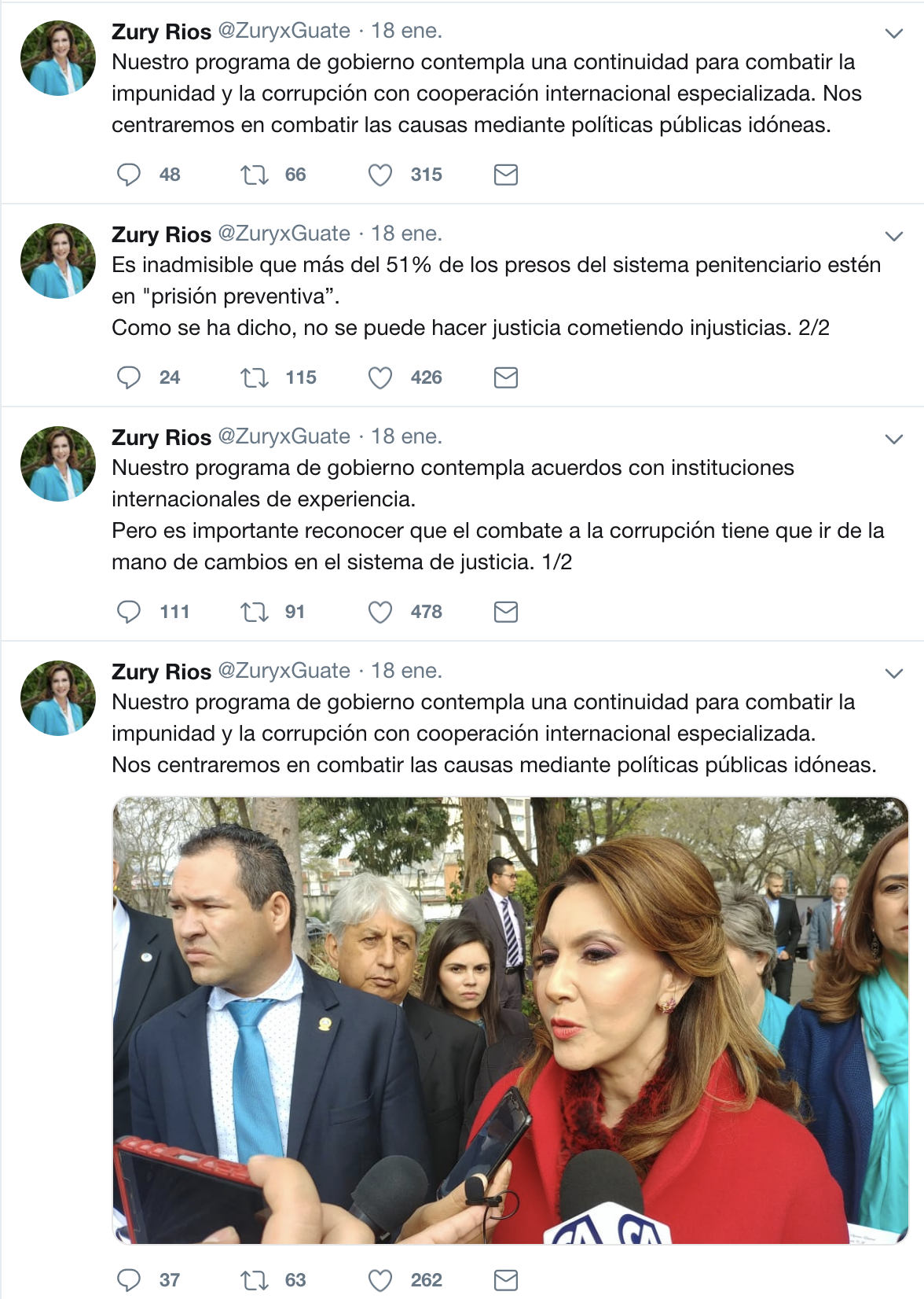 Se verificó la cuenta de redes sociales de los candidatos a la presidencia que han sido proclamados. Se determinó que en la última semana algunos comparten mensajes de sus propios partidos, otros ya han empezado a hablar de sus planes de gobierno, pese a la prohibición establecida en el artículo 62 bis del Reglamento de la Ley Electoral. Tal es el caso de Zury Ríos.